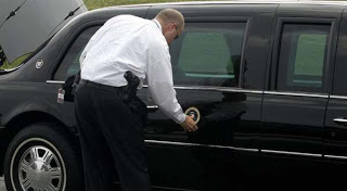 Back story is something along the lines of: the Presidential seal, which is just one of those magnetic door decal types, fell off the car. A police officer (or detective, or Secret Service agent, or somesuch) finds it and reattaches it.