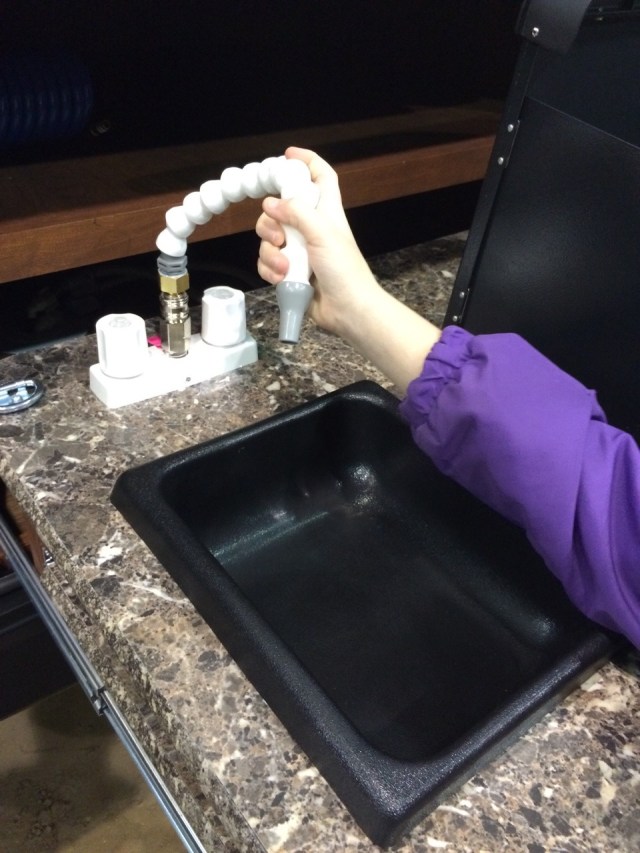 I think the fully-articulated faucet is fine. My concern is the lack of a drain in this outdoor kitchen’s sink–a catch basin. It’s problematic primarily because one needs to empty it somewhere and most RV parks and campgrounds frown on dumping -anything- outside the coach. So you’ll be left carefully lifting it out then dumping it inside the coach into the kitchen sink.