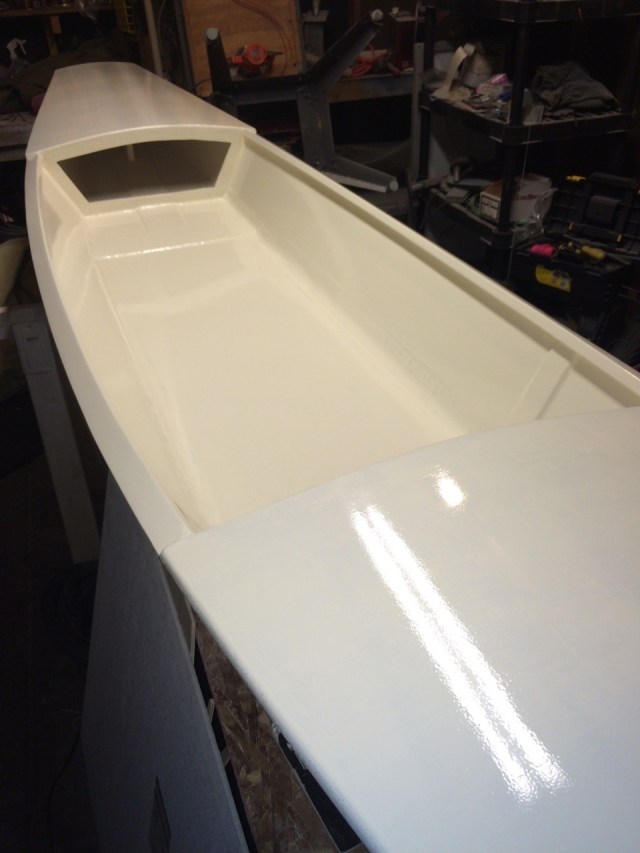 Not strictly “RV” related, but I do need to get my one-sheet punt finished before we can get the house on the market. Today, the first finish coat of cockpit and deck paint has gone on.