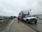 In other news, today was the first day pulling the new mega-bunkhouse. (Doing the final checks, in the rain, above)