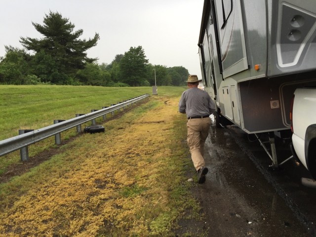 We managed to pull the trailer over and the tire came to rest at the same time right across from where it was supposed to be.