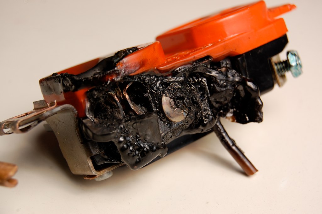 Hmm… that’s a red wire-nut… which would be rated for use on up to four 10-gauge wires on a 20-amp circuit. And it’s binding together only three (!) 14-gauge (!!) aluminum (!!!) wires. And it’s over-effing heated to the point that it’s melted.