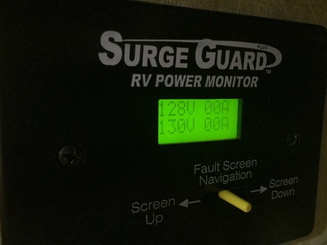 So this week, our SurgeGuard has steadfastly refused to switch power on when the pedestal voltage is over 129v on either leg. Overnight the voltage here reaches 133VAC. Legs are out of phase–and drifting! And the park hosts say, “yeah, we know–we just tell people not to use their SurgeGuards.”